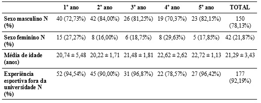 Os dados sociodemográficos dos(as) alunos(as) de cada ano são mostrados na Tabela 1. Dentre os(as) 192 participantes, 55 cursavam o 1º ano, 50 o 2º ano, 32 o 3º ano, 28 o 4º ano e 28 o 5º ano. Reforçamos que os(as) alunos(as) podem completar o curso em até seis anos, por isso, alguns participantes eram do 5º ano. Do total de estudantes, mais de 78% eram do gênero masculino.