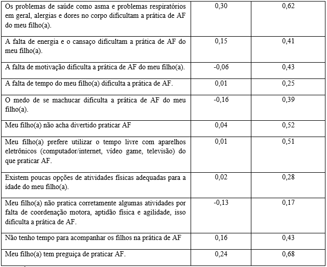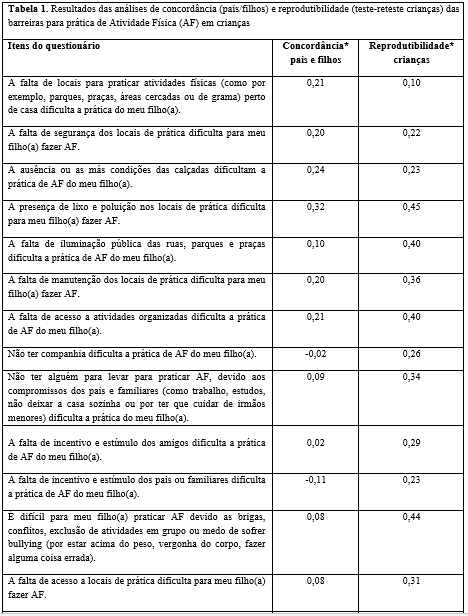 Na análise de concordância entre as respostas das crianças e dos seus pais ou responsáveis sobre as barreiras para AF das crianças, nenhuma das 24 questões obteve valores mínimos de concordância (Kappa mínimo de 0,4). Os valores variaram entre -0,16 para a barreira “O medo de se machucar dificulta a prática de AF” e 0,32 para barreira “A presença de lixo e poluição nos locais de prática dificulta para fazer AF” (Tabela 1).