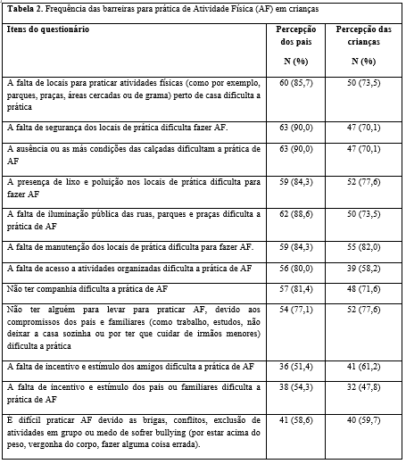 Em relação à frequência de resposta sobre as barreiras para prática de AF em crianças, a Tabela 2 apresenta os resultados da percepção dos pais ou responsáveis e das crianças, de forma que, foi realizado um agrupamento de respostas “às vezes” e “sempre” a fim de representar aquelas barreiras mais percebidas. Sendo que, entre as crianças as barreiras mais reportadas foram “a falta de manutenção dos locais de prática dificulta para fazer AF” (82%), seguida por “a presença de lixo e poluição nos locais de prática dificulta para fazer AF” (77,6%) e “não ter alguém para levar para praticar AF devido aos compromissos dos pais e familiares dificulta a prática” (77,6%). Já os pais, referem “a falta de segurança dos locais de prática dificulta fazer AF” (90%) e “a ausência ou as más condições das calçadas dificultam a prática de AF” (90%) como principais barreiras, seguida de “a falta de iluminação pública das ruas, parques e praças dificulta a prática de AF” (88,6%).