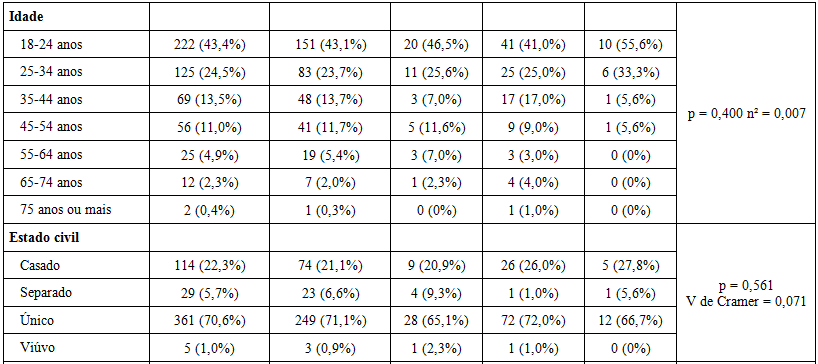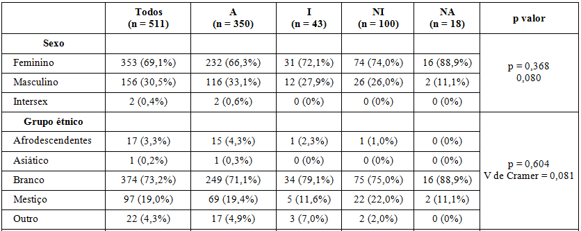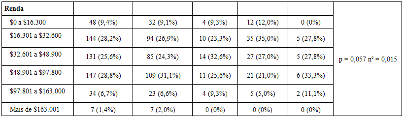 A Tabela 1 apresenta a frequência absoluta e relativa da caracterização da amostra. A primeira coluna apresenta os valores relativos a toda a amostra. A seguir, apresentamos os dados por perfil de nível de AF. Os valores de p apresentados referem-se ao efeito geral dos grupos nas diferentes categorias. Torna-se relevante destacar, que em função do alto número de categorias nas variáveis renda e idade, optou-se por utilizar o teste não paramétrico de Kruskall-Wallis ao invés do teste de Fisher. O teste post hoc não apresentou diferenças significativas entre os grupos em relação a idade. As comparações realizadas entre os grupos para variável renda apontou diferença significativa entre os grupos NI e NA (p = 0,037), no qual o primeiro grupo apresentou mediana $32.601 a $48.900 (min. = $0 a $16.300, max. = $97.801 a $163.000), e o segundo grupo $32.601 a $48.900 (min. = $0 a $16.300, max. = Mais de $163.000).