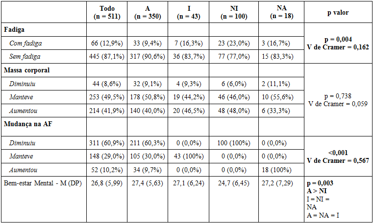 A Tabela 2 apresenta as variáveis de características psicossociais na amostra total e nos diferentes grupos. Os valores de p assinalados em negrito demonstram variáveis diferentes estatisticamente entre os grupos. Quanto à fadiga, o grupo A obteve menor prevalência de pessoas consideradas fadigadas comparado aos outros grupos. Além disso, o grupo A apresentou maiores níveis de bem-estar mental quando comparado com os NI (p < 0,001; d de Cohen = 0,459), valores similares aos I (p = 1; d de Cohen = 0,048). O grupo NI, apesar de obterem menor média de bem-estar mental, não apresentaram diferença comparado ao grupo I (p = 0,133, d de Cohen = -0,375) e ao NA (p = 1, d de Cohen = 0,008), significativa. O grupo NA não apresentou diferença significativa em comparação ao NI também (p = 0,427, d de Cohen = -0,372) nem em comparação ao A (p = 1, d de Cohen = 0,039).