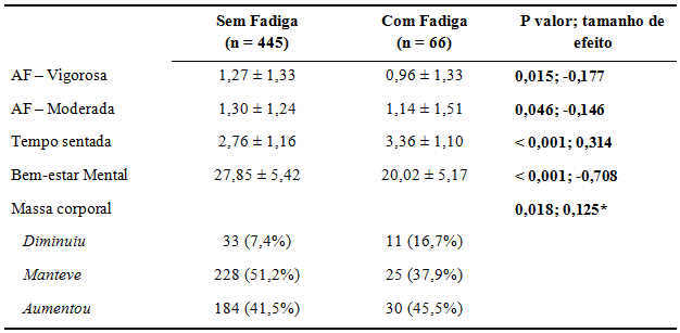 Por fim, embora não fosse objetivo central, com os resultados, percebemos a importância da fadiga. A Tabela 3 apresenta as diferenças entre pessoas classificadas como sem fadiga e fadigadas. Todas as comparações foram significativas, ressaltando que apenas o bem-estar demonstrou um tamanho de efeito grande. O tempo na posição sentada apresentou tamanho de efeito moderado, e AF, tanto vigorosa quanto moderada apresentaram tamanho de efeito pequeno.
