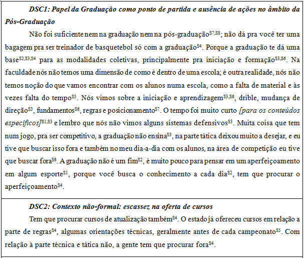 No DSC1 os treinadores foram unânimes ao apontar que a graduação e/ou pós-graduação não foram suficientes para contemplar os conteúdos específicos que os habilitassem à sua atuação no basquetebol em âmbito escolar. Em relação ao primeiro ponto apresentado pelos treinadores, esses entendem que houve pouco tempo dedicado ao basquetebol, o que dificultou o aprofundamento nos aspectos que envolvem a sua especificidade. Porém, esses mencionaram que foram enfatizados na graduação elementos estruturais do jogo, como aspectos técnico-táticos, regras e sistemas. Embora o tempo dedicado à especificidade tenha sido curto, o acesso a tais elementos específicos do basquetebol, em conjunto com outras disciplinas ao longo da formação acadêmica, é visto pelos treinadores como um ponto fundamental para o trabalho de iniciação e formação esportiva, assim como apontado pelos treinadores entrevistados por Rodrigues et al. (2016) no Estado de São Paulo.