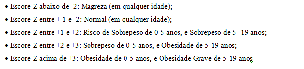 Em consonância com as recomendações da Organização Mundial de Saúde, o sobrepeso e a obesidade foram determinados com Índice de Massa Corpórea igual a superior ao percentil 85 a 95 para a faixa etária e sexo do indivíduo, respectivamente. O sobrepeso foi caracterizado como índice peso/altura entre os valores +1 e +2 Escores-Z, e obesidade caracterizada com índice peso/altura maior que +2 Escores-Z