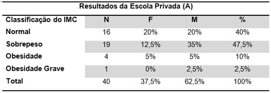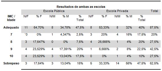 Podemos observar que o IMC adequado e obesidade foram maiores na escola pública, contudo tivemos maiores resultados de sobrepeso na escola privada, nos deparando com elevados resultados no gênero masculino. Na somatória de sobrepeso e obesidade tivemos 52,5% na escola pública e 60% na escola privada.