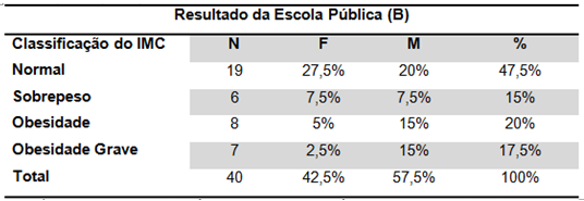 Em relação aos dados obtidos na escola B (Escola Pública), foram observados no gênero feminino que 27,5% foram classificados com IMC adequado de ≤ + 1 e ≥ -2 Escore-Z e 7,5% se enquadraram na classificação de Sobrepeso com Escore-Z de ≤ + 2 e ˃ + 1. Já no quadro de Obesidade obteve-se 5% das participantes com Escore-Z ≤ + 3 e + ˃ 2 e 2,5% com Escore-Z ˃ + 3 com diagnóstico de Obesidade Grave.