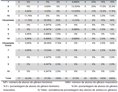 Já no gênero masculino foram encontrados 20% com Escore-Z + 1 e ≥ -2 com IMC considerado adequado e 7,5% ≤ + 2 e ˃ + 1 escores Z com Sobrepeso. A classificação de Obesidade atingiu 15% dos meninos com Escore-Z ≤ + 3 e + ˃ 2 e o índice indicando Obesidade Grave também se obteve 15% dos participantes com Escore-Z ˃ + 3. Assim, pode-se observar que o sobrepeso foi o mesmo percentual em ambos os gêneros e quando se refere à obesidade os meninos apresentaram maior índice. Em relação ao IMC adequado as meninas tiveram maiores números nessa classificação. A somatória do quadro de obesidade atingiu 7,5% das meninas e 30% dos meninos (Tabela 2).