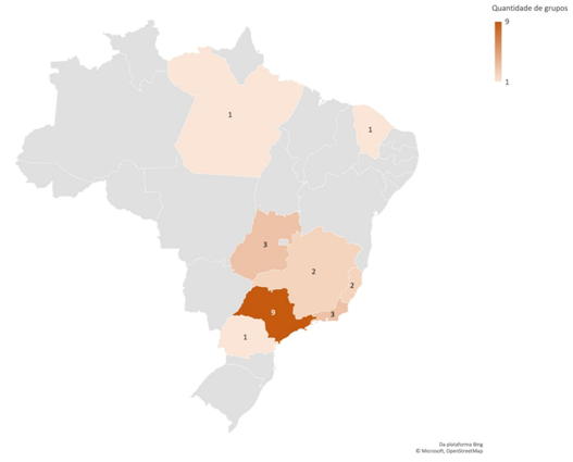A respeito da localidade, observamos uma concentração de grupos na região Sudeste (Figura 1), dado que parece convergir com um cenário indicado por outros estudos que revelam uma centralização nesta região com relação ao desenvolvimento das práticas gímnicas, incluindo a GPT (Carbinatto et al., 2016; Patrício et al., 2020). A quantidade de grupos/praticantes, a maior oferta de locais de prática (como clubes socioesportivos, escolas, universidades e outras instituições), a quantidade de professores/treinadores, entre outros aspectos, talvez possa estar associada à maior produção de conhecimento sobre a temática nessa região (Carbinatto et al., 2016; Oliveira et al., 2021; Simões et al., 2016).