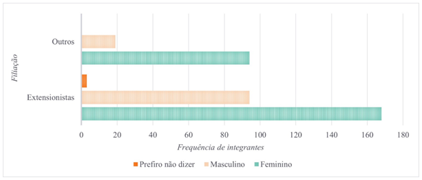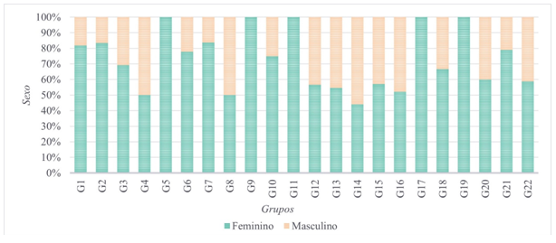 Ao observamos a Figura 3 acima conjuntamente com a distribuição dos grupos da Figura 2 antes apresentada, duas questões nos chamam a atenção. Dos 22 grupos estudados, cinco são compostos exclusivamente por integrantes do sexo feminino (G5, G9, G11, G17, G19), sendo que G5, G9 e G19 são da categoria “Outros”, não fazendo parte do contexto extensionista. O G11, embora institucionalmente seja considerado um projeto de extensão, tem uma proposta diferenciada, direcionada para a adesão de mulheres adultas maiores, isto é, sem vínculo como estudante universitário. Por outro lado, temos cinco grupos que possuem uma composição expressivamente equilibrada (G4, G8, G13, G14 e G16), e todos eles são projetos extensionistas. Esses dados nos fizeram identificar um predomínio da maior participação de integrantes do sexo masculino entre os grupos universitários, o que pode ser interpretado a partir do Gráfico 3. Uma possibilidade de interpretação desse dado é que o projeto extensionista, pelo vínculo com o ambiente crítico e reflexivo oriundo da universidade (ou que ao menos assim deveria ser), pode ser considerado um espaço mais plural e, por vezes, menos estereotipado para a promoção de diferentes práticas do corpo — e, por isso, talvez mais permissivo com a quebra de engendramentos como, por exemplo, acerca do gênero nas práticas gímnicas (Oliveira et al., 2021), que são no senso comum prioritariamente associadas ao público feminino.