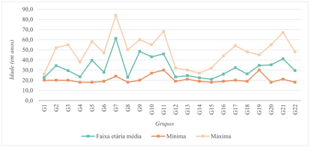 A ausência da divisão dos praticantes em categorias etárias na prática da GPT é algo que decorre da ausência de códigos institucionalizados (FIG, 2023), o que faz com que a composição dos grupos neste quesito possa ser, ora muito homogênea, ora muito heterogênea (Menegaldo et al., 2023). Essa característica fica evidente ao analisarmos o contexto dos grupos estudados (Figura 4), nos quais é possível encontrar coletivos constituídos por integrantes de idades muito similares, mas também muito distintas, cenário que se nota em 15 dos 22 grupos, que possuem uma diferença entre a idade mínima e máxima dos integrantes maior do que 20 anos.