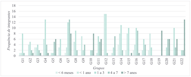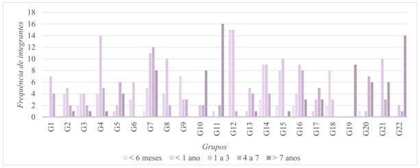 Como última variável de análise, apresentamos os dados referentes ao tempo de envolvimento dos praticantes com a GPT, variável que já foi tema de outras análises que investigam os modos de funcionamento dos grupos desta prática gímnica, especialmente pensando as influências que o tempo de prática pode oferecer nas dinâmicas relacionais entre integrantes de um mesmo grupo (Menegaldo e Bortoleto, 2020; Menegaldo, 2022). Em uma primeira perspectiva (Figura 6), traremos o tempo de contato com a prática, independente do vínculo com um determinado grupo, vínculo este que será explorado na Figura 7, que apresenta o tempo de permanência/atividade dos integrantes em seus respectivos grupos atuais, isto é, do momento da participação na pesquisa. A Figura 8, por fim, apresenta uma síntese destes dados, não mais divididos por grupo, mais sim por categorias de tempo de participação, o que nos possibilita outras análises.