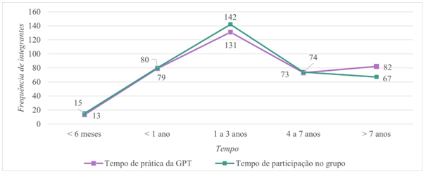 Ao analisarmos a frequência de integrantes nas cinco categorias, nos deparamos com um cenário curioso. Entre os 378 praticantes de GPT que participaram da pesquisa, 41% indicaram ter contato com a prática por tempo superior a quatro anos, número que se mantém elevado entre os integrantes com mais de quatro anos de pertencimento aos seus grupos (37,3%). Na mesma esteira, a categoria que reúne os integrantes que praticam e pertencem aos seus grupos entre 1 e 3 anos também conta com uma frequência alta, representando 34,6% e 37,5% dos participantes, respectivamente. Isso nos mostra que tanto para o tempo de contato com a prática como para o tempo de participação no grupo, menos de um terço dos participantes pratica/compõe os grupos de GPT num período inferior a um ano.