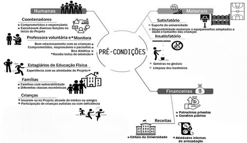 Pré-condições: condições financeiras, ginásios, materiais, apoio financeiro, características dos participantes, envolvimento e relações estabelecidas entre os envolvidos no Projeto;