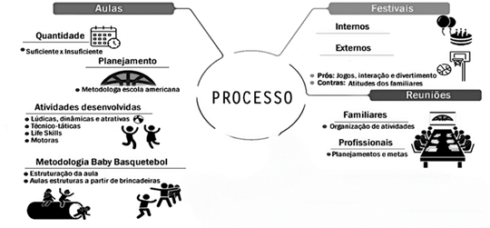 Os resultados apresentados no processo de formação esportiva por meio do Projeto Baby Basquetebol enfatizam elementos das conquistas individuais e da cultura organizacional desse ambiente (Figura 3). Destaca-se assim que não foram observadas, tanto nos documentos analisados quanto nas entrevistas com os participantes, menções às conquistas coletivas obtidas dentro do Projeto. Isto remete a uma verificação de coerência entre o processo ofertado e os resultados esperados e alcançados, haja vista que se almeja o desenvolvimento (motor, cognitivo, social) das crianças por meio do esporte, em detrimento da participação e de conquistas em competições esportivas, nesta faixa etária.