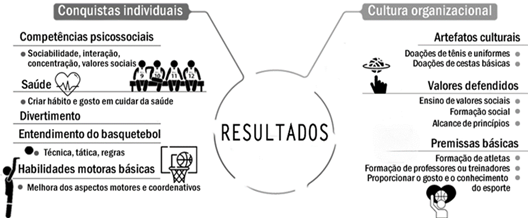 O Projeto Baby Basquetebol não revelou conquistas coletivas, ao passo que conquistas individuais, como desenvolvimento de competências psicossociais (sociabilização, interação, concentração; valores sociais), juntamente com a criação de hábitos saudáveis, cuidado com a saúde e divertimento foram enfatizadas. Os artefatos da cultura organizacional são representados pelas doações de tênis e vestimentas para as crianças, além da identificação destas no Projeto, por meio do uso dos uniformes com a logo marca, enquanto os valores expressados envolvem comprometimento, interação social e alcance de princípios que permitam engajamento no esporte e prática esportiva sem pressão. Quanto as premissas básicas, destacaram-se o interesse na formação de crianças, por meio do basquete, o fomento ao gosto e ao conhecimento do basquete, além da formação profissional de professores e treinadores.