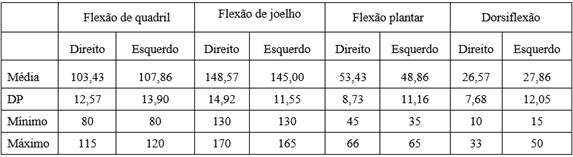 A avaliação da flexibilidade dos membros inferiores foi realizada utilizando um goniômetro pendular da marca Sanny. As posições avaliadas incluíram flexão do quadril com o joelho estendido em decúbito dorsal, flexão do joelho em decúbito ventral, dorsiflexão e flexão plantar em decúbito dorsal, todas em uma maca de tratamento. A participante relatou o ponto de desconforto em todas as posições, indicando se a amplitude de movimento poderia ser aumentada até o seu limite. Em todas as análises, o membro inferior não avaliado permaneceu fixo na mesa, e o teste foi concluído quando a atleta alcançou sua amplitude máxima de movimento. Todos os testes foram realizados três vezes para cada lado.