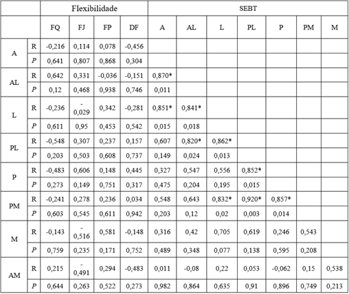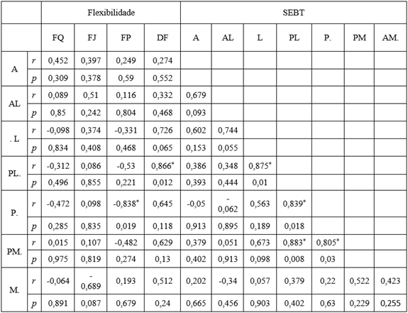 Foram demonstradas correlações positivas entre o desempenho de alcance PL com AL e L (r=0,820; p<0,05), (r=0,862; p<0,05), respectivamente. Também houve demonstrações entre o desempenho de alcance PM com L, PL e P (r=0,832; p<0,05), r=0,920; p<0,05), r=0,857; p<0,05). A demonstração mostrou uma clareza entre o desempenho de alcance L com A e AL (r=0,851; p<0,05), r=0,841; p<0,05), respectivamente. Houve um brilho entre o desempenho de alcance P e PL (r=0,852; p<0,05) e um forte brilho entre o alcance AL e A (r=0,870; p<0,05). Nenhuma especificação foi revelada entre o desempenho no teste SEBT e a flexibilidade.