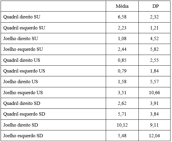 Os resultados do GMOV são apresentados nas tabelas 5 a 7. A Tabela 5 apresenta os resultados dos testes SU, SD e US. A Tabela 6 mostra as correlações entre a variação angular das articulações do joelho e tornozelo no SU. Por fim, a tabela 7 apresenta as correlações entre a variação angular das articulações do joelho e tornozelo em SD e US.