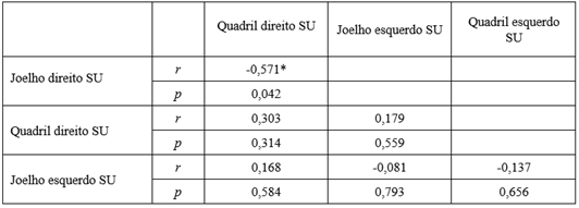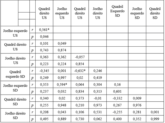 Foi observada correlação negativa moderada entre o ângulo de desalinhamento do quadril no teste US realizado com o membro inferior direito e o ângulo de desalinhamento do quadril no teste SD realizado com o membro inferior esquerdo (r=0,632; p<0,05). Houve também correlação positiva moderada entre o ângulo de desalinhamento do quadril e do joelho no teste de US realizado com o membro inferior direito. Além disso, foi encontrada correlação positiva moderada entre o ângulo de desalinhamento do joelho esquerdo no teste de US e o ângulo de desalinhamento no teste Step-Down realizado com o membro inferior esquerdo (r=0,594; p<0,05).