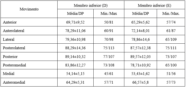 Os resultados do teste SEBT são apresentados na Tabela 1 para ambos os membros inferiores direito e esquerdo como média, desvio padrão, mínimo e máximo. Na Tabela 2, os resultados do teste de flexibilidade. Nas Tabelas 3 e 4 mostram correlações entre flexibilidade e SEBT nos membros inferiores direito e esquerdo.