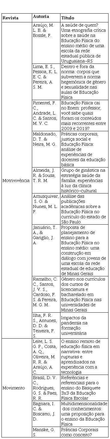 Como citado anteriormente, e de acordo com os critérios adotados, foram definidos quatro periódicos do campo sociocultural da Educação Física para que fosse feita a análise. São elas: a Revista Brasileira de Ciências do Esporte (RBCE), a Revista Movimento, a Revista Pensar a Prática e, por último, a Revista Motrivivência.