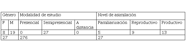 Los estudiantes, de una población de 62 alumnos, se seleccionó como muestra, los 26 matriculados en primer año de la carrera, que representan el 42 %. Siendo esta muestra representativa al abarcar el 100 % de los estudiantes que reciben la asignatura Morfología Funcional en la Actividad Física. También se tomó en consideración que se encuentran en los primeros años y durante el tránsito por la carrera tendrán la oportunidad de materializar su actuación no solo en el componente académico, sino también en la extensión universitaria, el investigativo y la práctica laboral que les permita obtener las herramientas para su desempeño profesional por medio de la praxis.