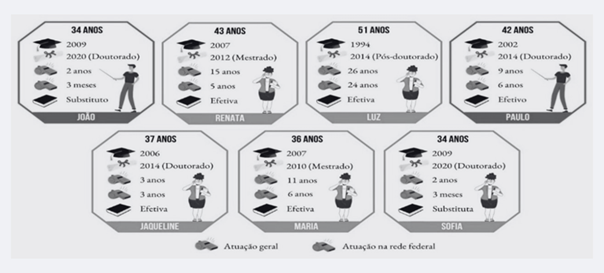Os participantes da pesquisa foram selecionados de acordo com os seguintes critérios de inclusão: (a) professores de Educação Física, (b) atuantes em turmas do ensino fundamental, (c) atuantes na rede federal de ensino da cidade de Florianópolis. Nove professores preencheram os critérios, todavia, sete aceitaram participar da investigação, sendo cinco efetivos e dois substitutos, os quais atuavam de três meses a 24 anos na rede federal (Figura 1). Destaca-se que na cidade de Florianópolis (SC), apenas uma escola da rede federal atende a etapa do ensino fundamental.