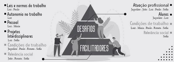 Ainda no contexto de facilitadores e desafios, a relevância social da disciplina foi mencionada pelos professores investigados, uma vez que três docentes a citaram como facilitadora, englobando sua valorização na escola e a importância de ouvir sobre os interesses dos estudantes e uma professora relatou como desafio, no sentido da desvalorização da disciplina por outros profissionais dentro da escola.