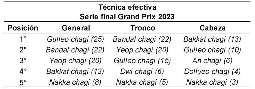 Se observó un total de 114 técnicas efectivas durante la serie final del Grand Prix 2023. Este hecho sugiere una baja tasa de efectividad de los espacios de interacción analizados (n=571).