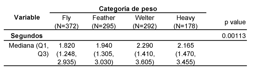 El análisis inferencial no paramétrico del resultado de la prueba Wilconox no fue significativo, siendo la diferencia de medianas de 0,05 segundos a favor del TL (IC 95%: -0,0601, 0,2300), p < 0,2472. En consecuencia, no hay suficiente evidencia empírica para rechazar la hipótesis nula. Contrariamente, el resultado de la prueba Kruskal-Wallis fue estadísticamente significativo (p < 0,00113), indicando que existe al menos una diferencia entre las categorías de peso. La Tabla 2 indica los resultados de la prueba según la variable temporal y la categoría de peso femenina. Las pruebas post hoc (utilizando la corrección Holm, técnica Pairwise test) indicó que la categoría fly presenta tiempos significativamente menores que la categoría de peso welter (p < 0,0024) y heavy (p < 0,0283). La Tabla 3 proporciona un análisis descriptivo de cada categoría de peso.