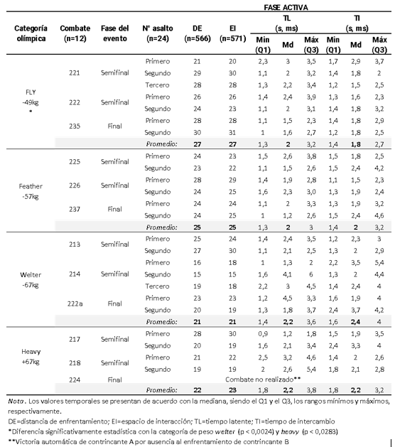 En cuanto a los elementos estructurales relacionados con el tiempo, nuestra investigación identificó una diferencia significativa entre el análisis temporal y las categorías de peso (p < 0,00113), indicando que la categoría fly experimenta menos segundos en TI. Otro hallazgo revela que la categoría de peso ≤49kg, en sumatoria, pasa mayor tiempo de intercambio. También, la categoría de peso welter muestra una tendencia hacia periodos de esfuerzo de alta intensidad por sobre periodos de esfuerzo de baja intensidad.
