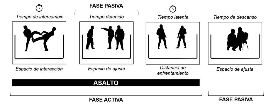 La fase activa abarca el tiempo completo del asalto, es decir, el cronómetro está en marcha. Se articula mediante el espacio de interacción (EI) y la distancia de enfrentamiento (DE). El primero refiere aquel espacio dependiente de las decisiones que tomen sobre atacar o evitar los ataques (Menescardi Royuela et al., 2020), cuyo objetivo principal consiste en anotar y/o evitar puntos. El segundo se refiere a aquella distancia que separa a ambos adversarios antes de que se produzca el ataque (Menescardi Royuela et al., 2020). El tiempo de intercambio (TI) añade una dimensión temporal, marcando la duración desde que uno de los deportistas inicia el movimiento de pie o mano hacia el oponente hasta que cesa el ataque (McLaughlin, 2020). En contraste, el tiempo latente (TL) emerge como un período en el cual no se llevan a cabo acciones combativas, lo que ofrece a los competidores oportunidades para la observación, planificación estratégica o recuperación.