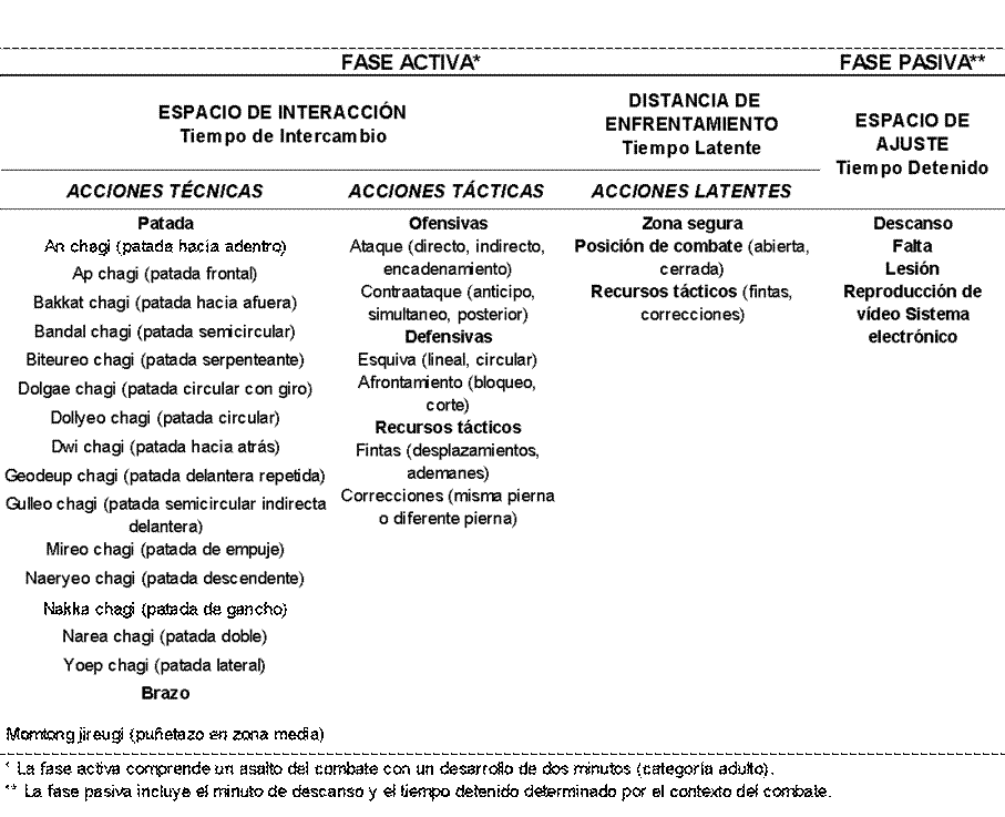 También en el marco del combate encontramos los elementos funcionales que se pueden dividir en acciones. Por un lado, las acciones técnicas, según González de Prado (2011), representan el resultado de llevar a cabo el gesto deportivo, donde las decisiones se originan en la propia acción del deportista, adaptándose tácticamente a las distintas situaciones competitivas. Estas acciones técnicas, con su estructura cinética básica, se dividen en fase preparatoria, inicial y final, destacando el énfasis en el uso estratégico de piernas y brazos. Este estudio menciona las técnicas de pateo y puño más populares respetando su terminología original en coreano. Para ello, se recurre al diccionario de la Sede Mundial de Taekwondo, Kukkiwon (2012), con el objetivo de estandarizar conceptos y abordar la falta de coherencia en la terminología técnica dentro de la comunidad del taekwondo.