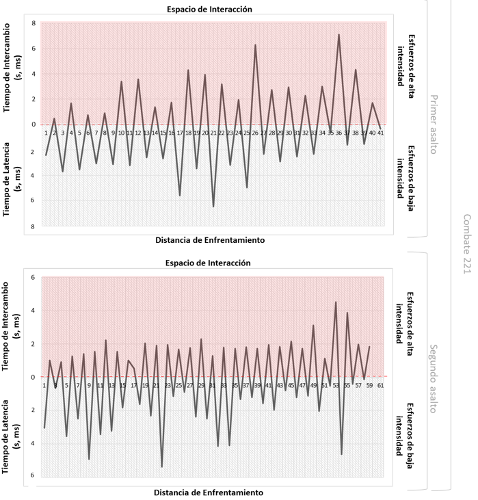 Sistematizado el proceso de análisis, se procedió a identificar lo que denominamos fase activa del asalto. Se registró en la matriz de datos la duración del tiempo (s, ms) en el que las atletas incluyen el EI (momento en que una de las deportistas comienza a mover el pie iniciando acciones ofensivas hasta que cesa la interacción, incluyendo momentos de latencia ≤ 0,5 ms), y el tiempo en el que se incluye la DE (momento en donde las atletas permanecen latentes previo al ataque > 0,5 ms). Además, se registraron las acciones técnicas que resultaron efectivas durante el evento.
