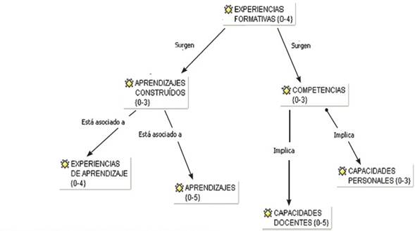 Tal como se muestra en la Figura 2, las Experiencias Formativas se hacen notables en tanto ofrecen la oportunidad de interactuar desde las prácticas con el contexto escolar y sus múltiples interrelaciones. Sin duda, se trata de oportunidades para comprender, interpretar y ejercer la docencia en un contexto real, lo cual permite que estas vivencias favorezcan la construcción de aprendizajes y el desarrollo de competencias para enseñar. Sobre esta base surgen las subcategorías Aprendizajes Construidos y Competencias.