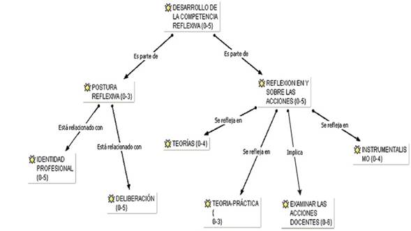 Representada por las capacidades que los participantes han desarrollado para examinar y cuestionar sus propias acciones a fin de describir y confrontar su práctica pedagógica. En tal sentido, se preguntan o intentan justificar sus actuaciones y plantearse posibles soluciones. Durante estas deliberaciones surge la dicotomía entre teoría y práctica aunada al instrumentalismo. En detalle veremos cómo se evidencia la competencia reflexiva (ver Figura 3) a través de las subcategorías Postura Reflexiva y Reflexión en y sobre las Acciones.