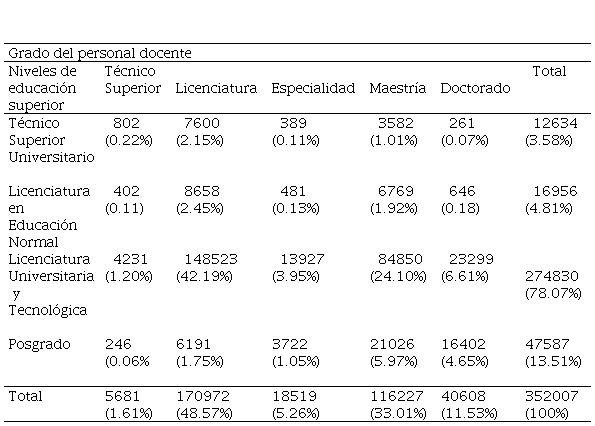Por otra parte, en 2015, como cita la Asociación Nacional de Universidades e Instituciones de Educación Superior (ANUIES, 2015) durante el ciclo escolar 2012-2013 en México, se contó con una planta de 352,007 docentes de universidades con distintos niveles de estudio que involucraban personal con un tiempo de dedicación muy variado como tiempo completo, medio tiempo y por horas, como también con un diferencial de grados académicos como doctorado, maestría, especialidad, licenciatura y técnico superior (ver Tabla 1).