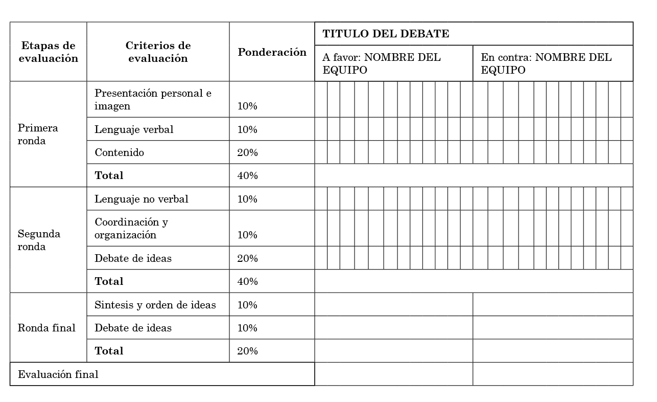 Definición y evaluación de la actividad de debate: este instrumento permite evaluar el “saber hacer” (procedimientos) y el “saber ser” (actitudes) a través de la observación, se focaliza en elementos tales como la cantidad y calidad de la información recopilada, la cantidad y calidad de las intervenciones, y el trabajo en equipo.