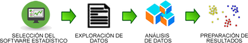 La existencia de volúmenes de datos, contenidos en bases de datos, en muchos casos excede nuestra capacidad humana para poder analizarlos y obtener información útil, realidad que viven día a día muchas organizaciones en el mundo. Personal experto se dedica a la búsqueda, en la inmensidad de datos, para encontrar patrones de comportamiento que ayuden anticipar nuestras decisiones (Camana, 2013). En este sentido, las decisiones se toman muchas veces con base en la intuición y las experiencias previstas en la información almacenada. Se intenta solucionar esto, mediante el proceso de análisis que contempla cuatro etapas: Selección el programa estadístico, exploración de los datos, análisis de datos y preparación de resultados. En la Figura 1, se muestra las etapas: