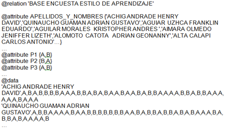 En la etapa de Exploración de los Datos, consistente en un proceso de limpieza de datos, se realizaron correcciones manuales, como la verificación de apellidos y nombres de estudiantes, para ello se verificó y se contrastó con listas proporcionadas por la Secretaría del Instituto Tecnológico Superior Vicente León. Dado que el archivo donde se almacenaron los datos es generado por la encuesta a través de un Formulario de Google, no fue necesario realizar tareas de integración ni de transformación. Cabe destacar que el único proceso utilizado fue la reducción de datos, que consistió en la eliminación de atributos, como: Fecha, hora, género, carrera, nivel y modalidad, por cuanto estos atributos resultaron irrelevantes para alcanzar el objetivo planteado. Se muestra en la Figura 3, la conversión del archivo de Excel a formato .arff en software Weka.