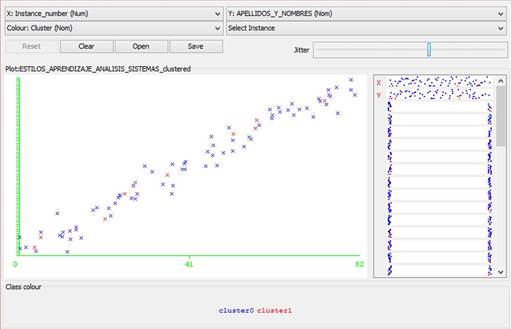 La técnica estadística descriptiva fue la más adecuada para el análisis de clustering, con el fin de identificar grupos homogéneos en el estudiantado encuestado. Es decir, el algoritmo FarthestFirst de Weka fue utilizado para tratar el problema de k centros (grupos), se pretendió obtener la máxima distancia entre una tupla (estudiante) y su centroide sea la mínima, de este modo, para descubrir el estilo de aprendizaje dominante de estudiantes, se decidió generar dos clusters.