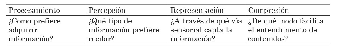 Los autores del modelo, Felder y Silverman (1988), se centran en dos aspectos. El primero, en el estilo de aprendizaje significativo en la educación de ingeniería en sistemas; el segundo, el estilo de aprendizaje preferido por el estudiantado y las estrategias que recepta este grupo, cuyos estilos de aprendizaje no son abordados por los métodos de enseñanza de ingeniería formal. Además, los autores proponen cuatro dimensiones para el análisis, entre las que constan: procesamiento (activo o reflexivo), percepción (sensorial o intuitivo), representación (visual o verbal) y compresión (secuencial o global). A continuación se presentan en la Tabla 1 los descriptores relativos a las mencionadas dimensiones.