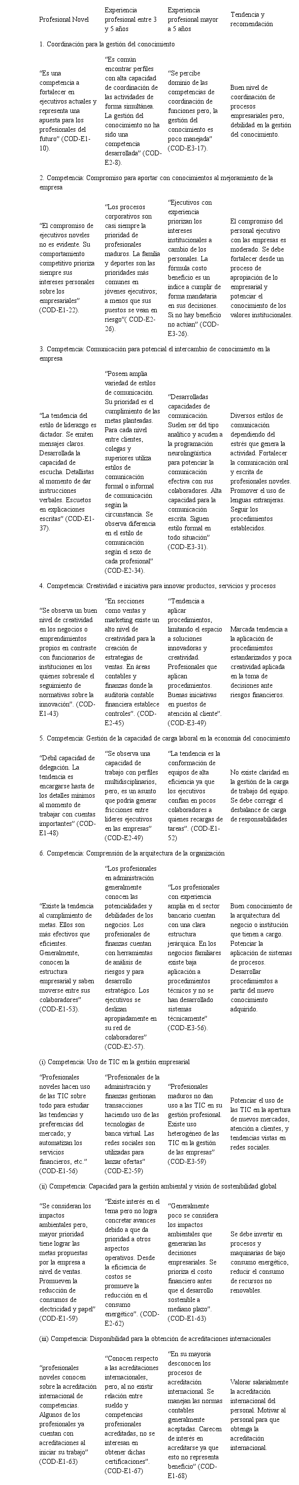 Se declara el cumplimiento del objetivo propuesto para este trabajo. Así, las competencias que requieren profesionales de la administración y finanzas del grupo estudiado han sido identificadas por medio de un proceso cuantitativo y cualitativo. Las competencias profesionales para transitar de forma más efectiva hacia la economía del conocimiento son: coordinación para la gestión del conocimiento; compromiso para aportar al mejoramiento de la empresa; comunicación para potenciar el intercambio de conocimiento; creatividad e iniciativa para innovar productos, servicios y procesos; gestión de la capacidad de carga laboral; comprensión de la arquitectura de la organización; uso de TIC en la gestión empresarial; capacidad para la gestión ambiental y visión de sostenibilidad, y disponibilidad para la obtención de acreditaciones internacionales.