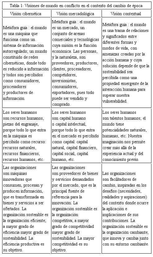 Cobra importancia, en este momento, recordar a De Souza Silva (2011, p. 104) cuando propone que el planeta tierra está experimentando la convergencia de, al menos, tres revoluciones en conflicto, las cuales pueden ser denominadas: la revolución cibernética, la revolución económica y la revolución contextual de mundo, y que cada una lleva implícita una determinada visión de mundo que, a su vez, se refiere a un determinado perfil de ser humano (Tabla 1).
