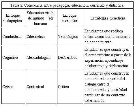 De manera tal que, buscar la coherencia, es decir, buscar el enfoque pedagógico presente en el Mandato Pedagógico Institucional, así como en sus distintas propuestas curriculares y didácticas, puede iniciarse descubriendo o reconociendo cuál visión de mundo subyace en ese perfil de ser humano, para luego encontrar el enfoque pedagógico que responde a cada una de estas visiones de mundo, y, con ello, detectar, con base en distintos enfoques curriculares, cuál de ellos es coherente con el Mandato Pedagógico Institucional. El mismo ejercicio puede hacerse con el tema didáctico.