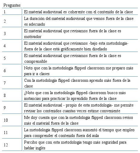 La variable del estudio correspondió a la percepción acerca del impacto que tiene la metodología flipped classroom sobre la naturaleza y condiciones del aprendizaje del idioma antes y durante la clase. Conforme a lo anterior, se diseñó y validó un cuestionario, por medio de Juicio de Expertos en educación, para explorar la percepción en las siguientes dimensiones: el aprendizaje antes de la clase, aprendizaje en el aula y la valoración de la metodología.