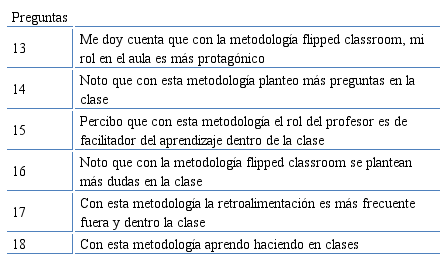 En cuanto a la percepción del aprendizaje fuera de la clase cuando se utiliza la metodología flipped classroom, la tabla 2 presenta los ítems que forman parte de esta dimensión del cuestionario. Además, el instrumento incluye los ítems referidos a la utilización del video como recurso didáctico central de la metodología implementada.