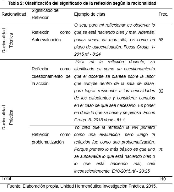 Finalmente, considerando los niveles de reflexión propuestos por Van Manen (1977), se propone una clasificación del significado de reflexión docente. En síntesis, la reflexión puede ser definida como un proceso de autoevaluación, cuestionamiento de creencias y una problematización de la acción profesional. En la Tabla 2 se presenta la clasificación del significado de la reflexión docente que emergió de los participantes de este estudio.