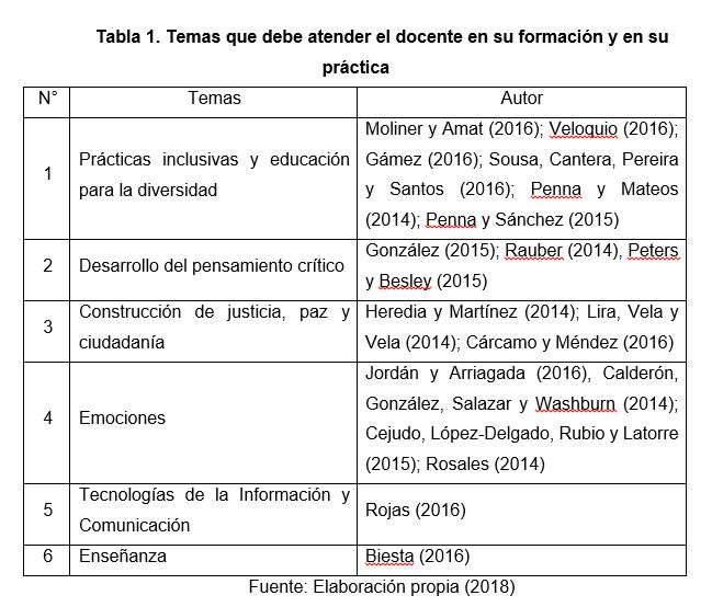 El trabajo docente se configura como un espacio complejo, inestable, signado por múltiples cambios y demandas. Tal hecho se puede evidenciar al realizar una sencilla revisión de opiniones de diversos autores en relación con las temáticas que deben atender y desarrollar las y los docentes. En la Tabla 1 se sintetiza el resultado de una búsqueda en diversas publicaciones sobre las cuestiones que deberían ser consideradas en la formación y el trabajo de los profesores.