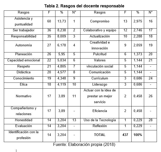 A partir de las expresiones del cuerpo docente se obtuvieron 437 respuestas que con el procedimiento de análisis de contenido mencionado se redujeron a 29 rasgos o características del profesorado responsable que se presentan a continuación organizados en una Tabla de frecuencia simple a la cual se le calculó el porcentaje que representan sobre el total obtenido.